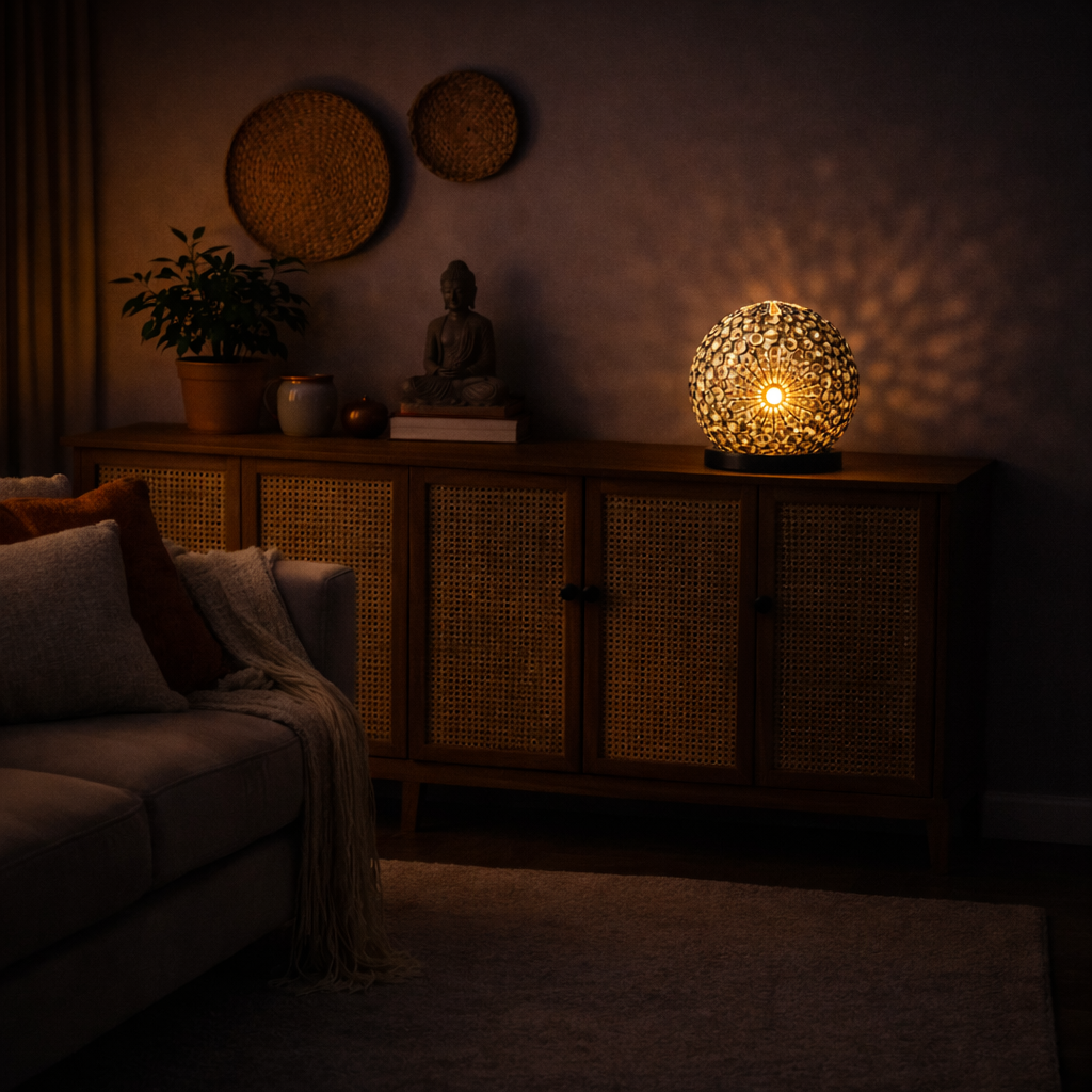 Each lamp is carefully created by skilled artisans using real seashells, arranged in a distinctive globe shape with an intricate chocolate twist pattern. When illuminated, the shells gently filter the light, creating a soft, atmospheric glow that adds character and warmth to any living space, bedroom, or cosy corner.